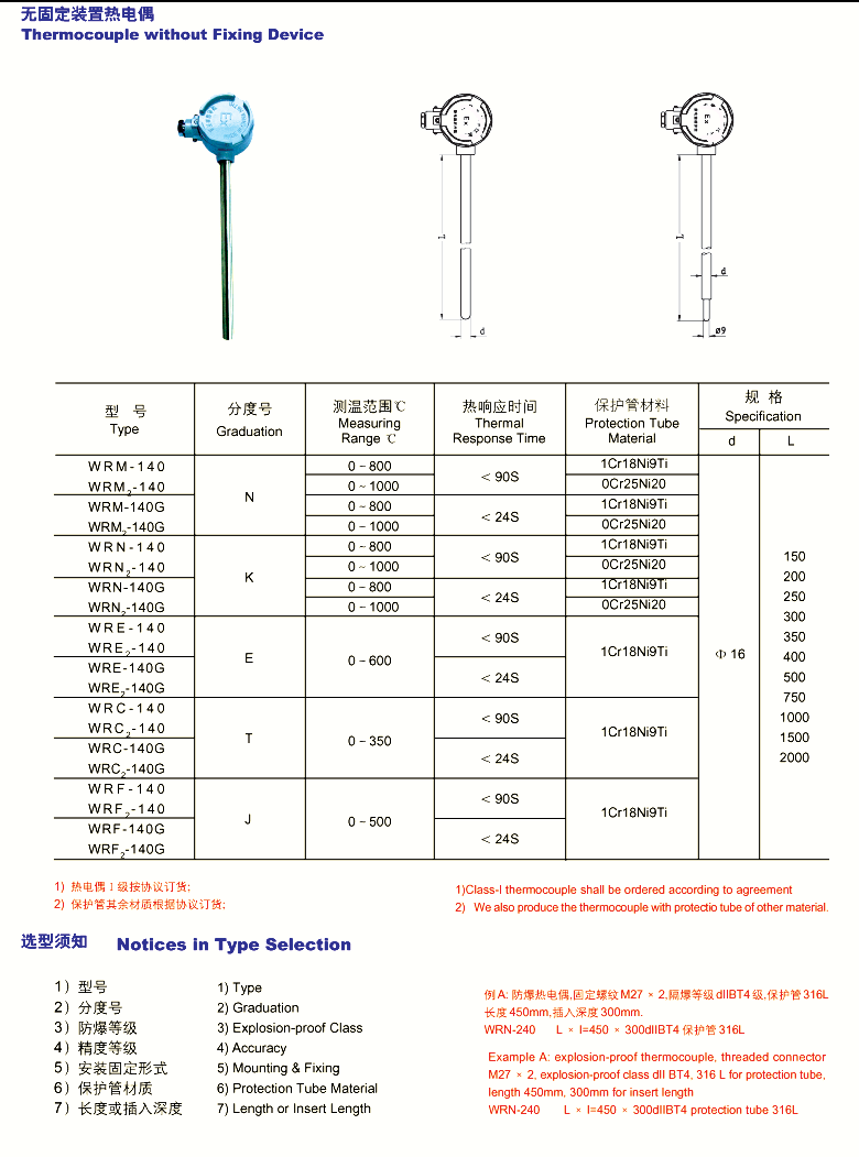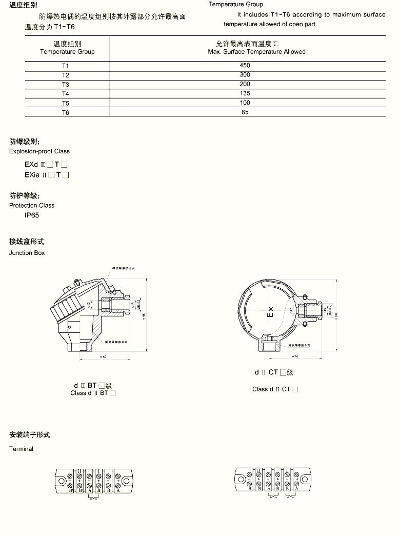 工业用隔爆热电偶、热电阻作为温度测量和控制的传感器与显示仪表配套,以直接测量和控制生产过程中的气体、液体和蒸汽的温度。 我厂生产的化工专用隔爆热电偶、热电阻产品防爆性能按国家颁布的“性环境用防爆电器设备”标准设计制造,热电特性符合国际IEC标准,并经国家仪器仪表防爆安全监督站测试合格. 隔爆热电偶 ,热电阻的结构、原理与装配方式基本相同,主要区别是隔爆产品接线盒(外壳)在设计上采用高强度铝合金压铸而成,并具有足够的内部空间,壁厚和机械强度,橡胶密封圈的热稳定性均符合国家防爆标准。所以当接线盒内部的性混合气体发生时,其内压不会破坏接线盒,而由此产生的热能不能向外扩散--传爆。只要用户严格遵守产品使用规则,产品就能达到可靠的防爆效果。