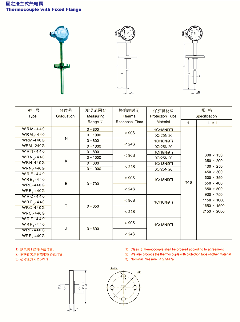 热电偶在环境温度为20±15°C,相对湿度不大于80%,试验电压为500±50V(直流)电极与外套管之间的绝缘电阻>1000Ω.m