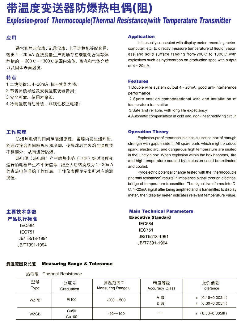 简单介绍 带温度变送器热电偶又称一体化热电偶,一体化热电偶是指在热电偶或热电阻的防水或隔爆接线盒内装入放大变送模块,即温度变送器,与传感器连接形成一体化,输出标准4-20mA 电流信号或也可以输出0-5V或1-5V的电压信号。通常和显示仪表、记录仪表、电子计算机等配套用,直接测量各种生产过程中的0度-1300度范围内的液体、蒸汽和气体介质以及固体表面温度。