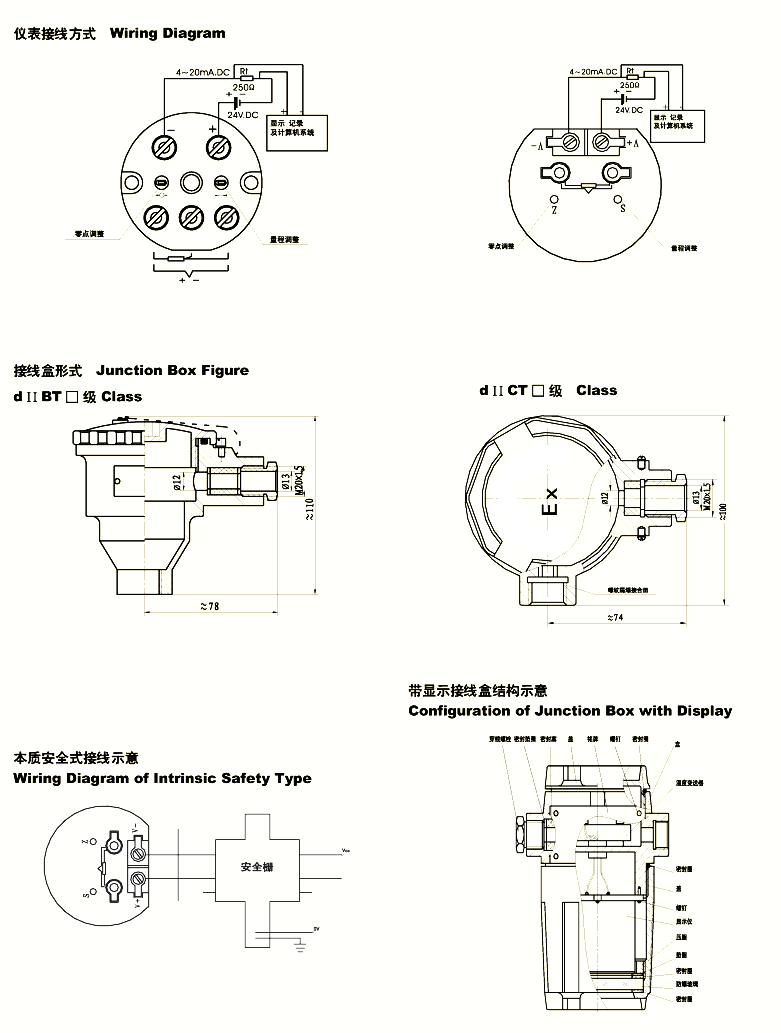 输出信号:4~20mA,负载电阻250 1/2、传输导线电阻100 1/2