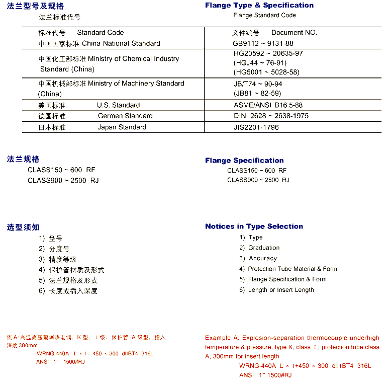例 A :高温高压隔爆热电偶 K 型 1 级 保护管 A 级型 插入深度 300mm. WRNG-440A L × 1=450 × 300 mm. d Ⅱ BT4 316L ANSI 1 ″ 1500 # RJ