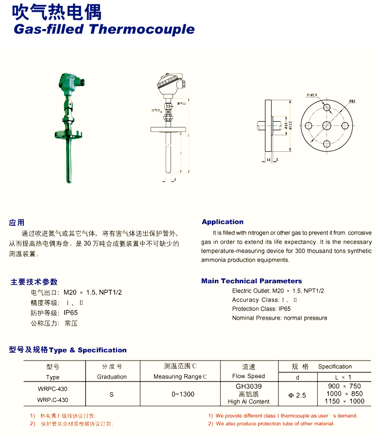 1、应用: 吹气热电偶 通过吹进氮气或其它气体,将有害气体送出保护管外,从而提高热电偶寿命。是30万吨合成氨装置中不可缺少的测温装置。 2、主要技术参数: 电气出口:M20X1.5,NPT1/2 精度等级:I II 防护等级:IP65 公称压力:常压 |