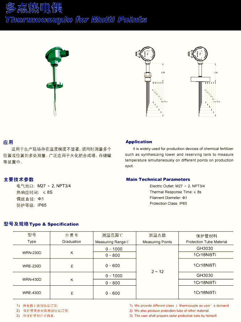 1)热电偶I级按协议订货; 2)保护管其余材质根据协议订货;3)外保护管用户应自备; |