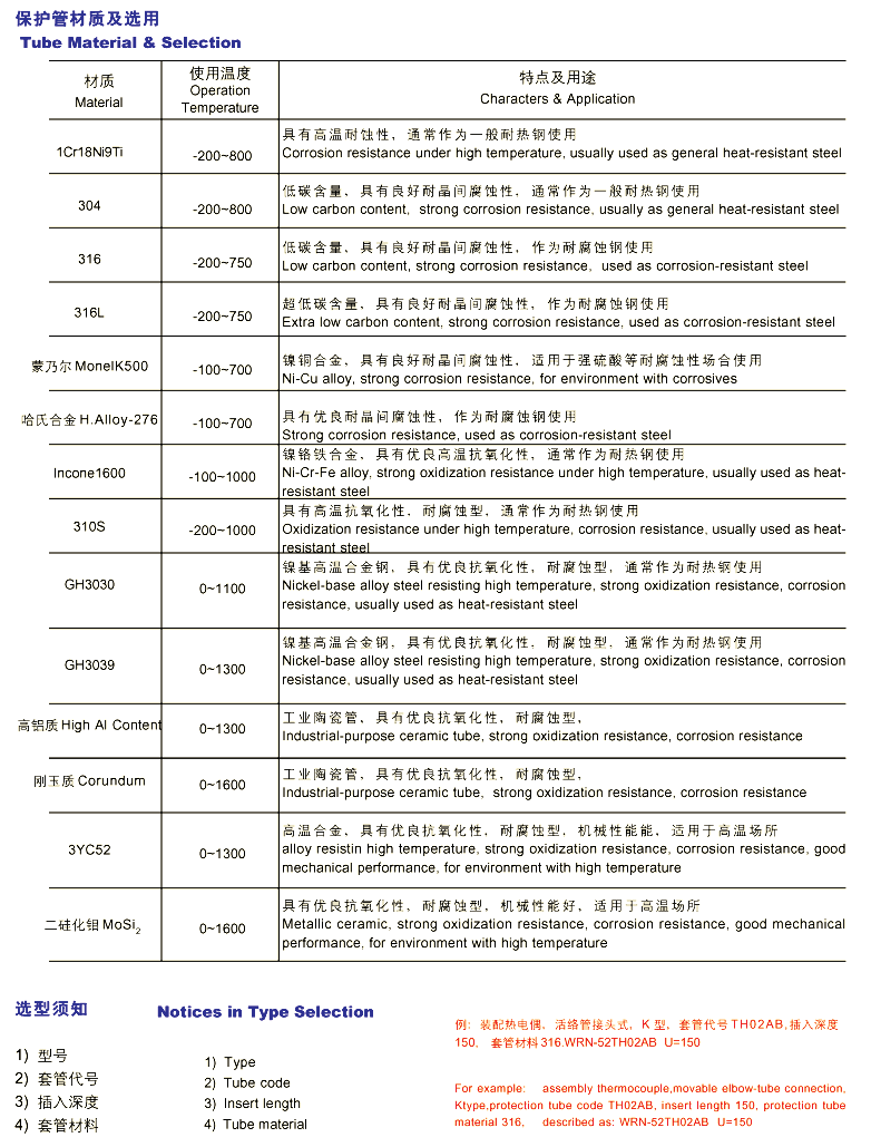 例:装配热电偶,活络管接头式, K 型,套管代号 TH02AB ,插入深度 150 ,套管材料 316 : WRN-52TH02AB U=150
