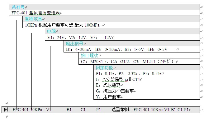FPC-401 型风差压变送器采用硅压阻式差压芯体组装而成。外壳为铝合金结构。两个压力接口为M10螺纹和旋塞结构(用户可选择压力接口尺寸),可直接安装在测量管道上或通过引压管连接。FPC-401型有毫伏、标准电压、电流、频率信号输出等可供选择,安装使用方便,广泛应用于锅炉送风、井下通风等电力、煤炭行业压力过程控制领域。