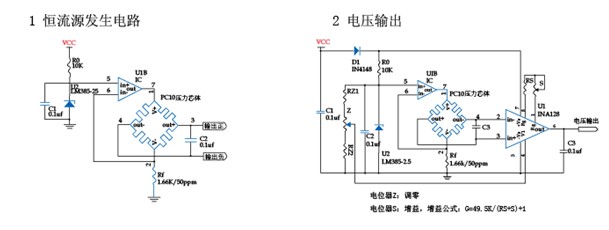 XTR101是相当好的电路两线4-20mA电路,电路本身带有调零功能,还有2路1mA的恒流电源,可以单独用任意一路给压力芯体供电,也可以合在一起2mA供电,推荐采用1mA供电方式,同时在压力芯体电源负串接1~1.6KΩ普通电阻即可。(http://www.fx-sensor.com 010-51295202)
