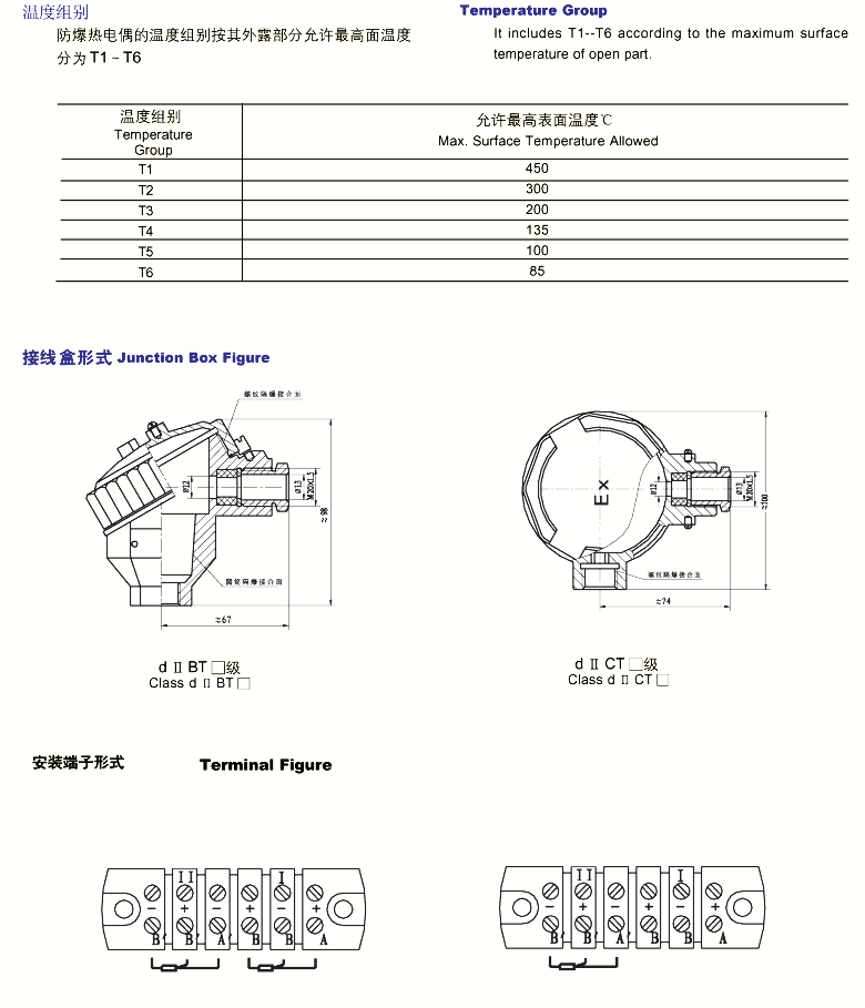 我厂生产的化工专用隔爆热电偶、热电阻产品防爆性能按国家颁布的性环境用防爆电器设备标准设计制造,热电特性符合国际IEC标准,并经国家仪器仪表防爆安全监督站测试合格.