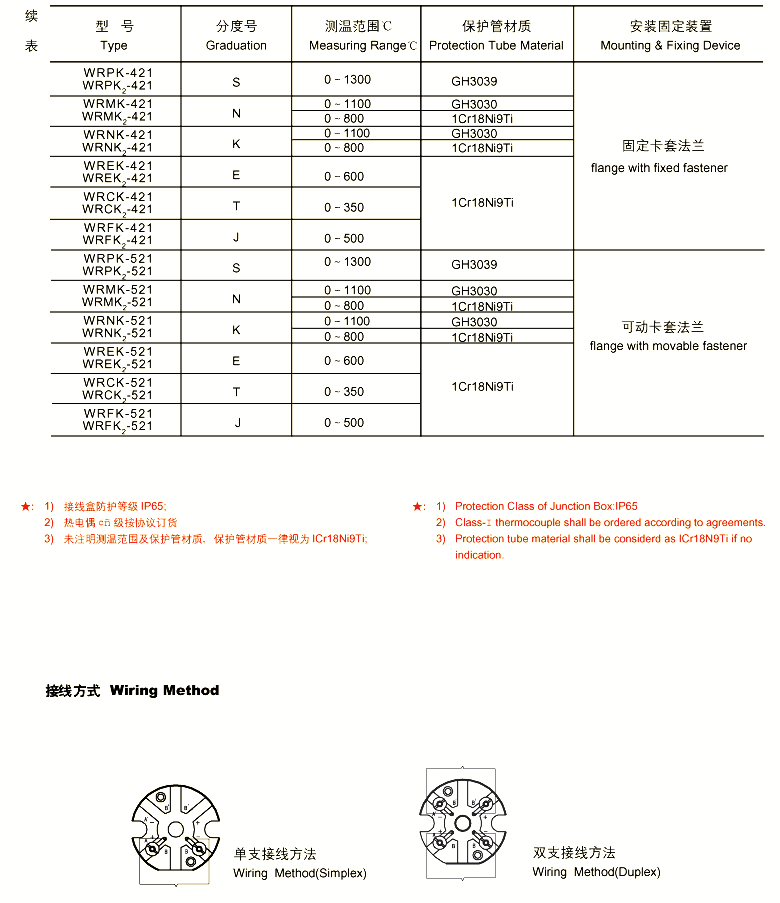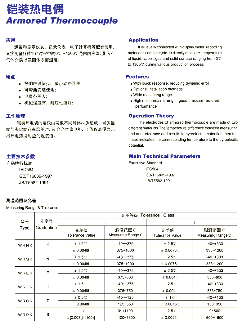 4、主要技术参数 产品执行标准 IEC584 IEC1515 GB/T16839-1997 JB/T5582-91
