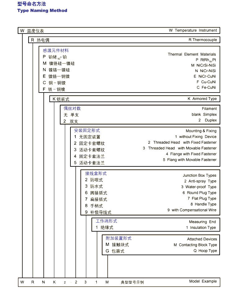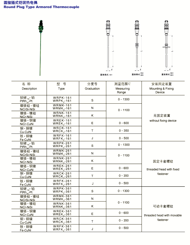 2、特 点 ·热响应时间少,减小动态误差; ·可弯曲安装使用; ·测量范围大; ·机械强度高,耐压性能好; 3、工作原理 铠装热电偶的电极由两根不同导体材质组成。当测量端与参比端存在温差时,就会产生热电势,工作仪表便显示出热电势所对应的温度值。