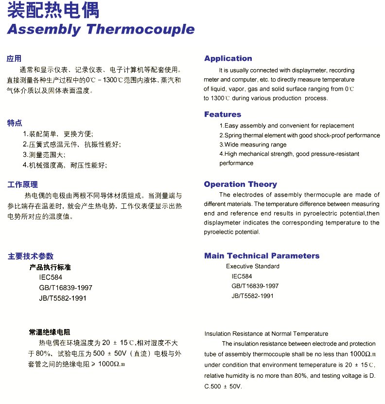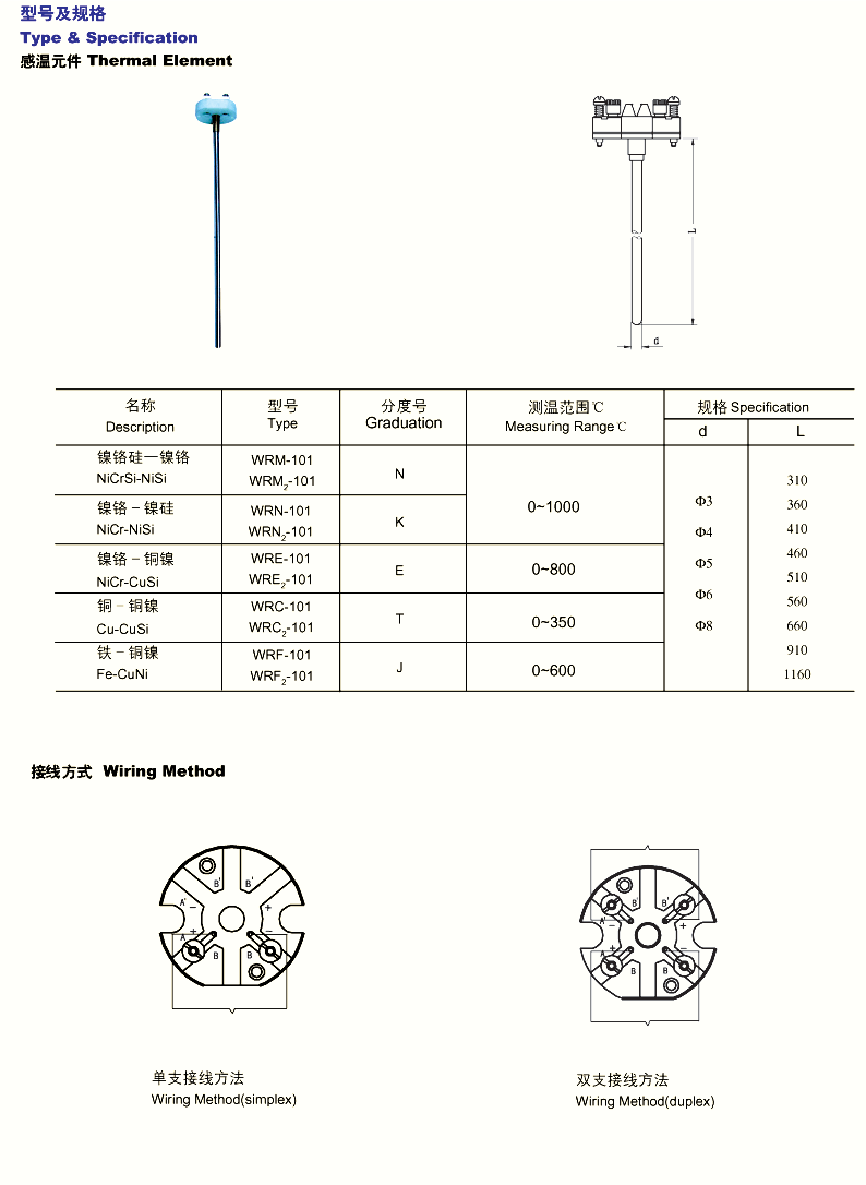 WRN-010K型热电偶芯子,为K型热电偶的测温元件,也可以直接用于测量温度。铂铑10-铂热电偶芯是作为更换铂铑热电偶的备件,也可以直接用于测温。WR系列工业用热电偶作为温度测量传感器 ,通常与温度变送器、调节器及显示仪表等配套使用,组成过程控制系统,用以直接测量或控制各种生产过程中0-1800℃范围内的流体、蒸汽和气体介质以及固体表面等温度。 |