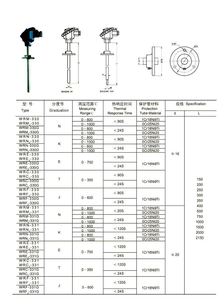 320.330型活动发兰热电偶,是法兰侧面采用螺栓顶住热电偶管来固定法兰,常用于不需密封单需要支点的场合。WR系列工业用热电偶作为温度测量传感器 ,通常与温度变送器、调节器及显示仪表等配套使用,组成过程控制系统,用以直接测量或控制各种生产过程中0-1800℃范围内的流体、蒸汽和气体介质以及固体表面等温度。