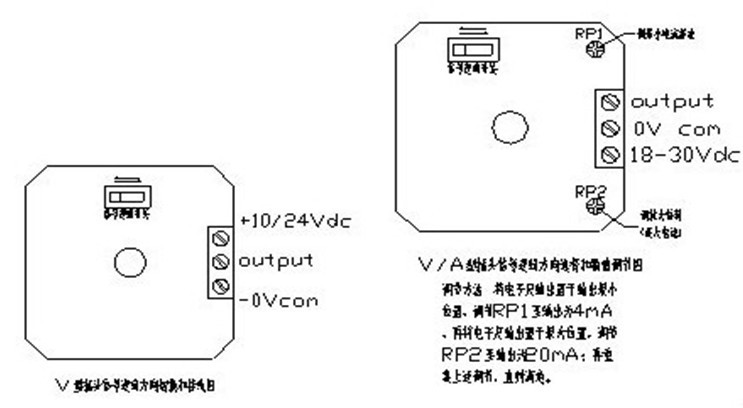 输出 0~10Vdc 和 10~0Vdc 两种输出,最小负载电阻5KΩ